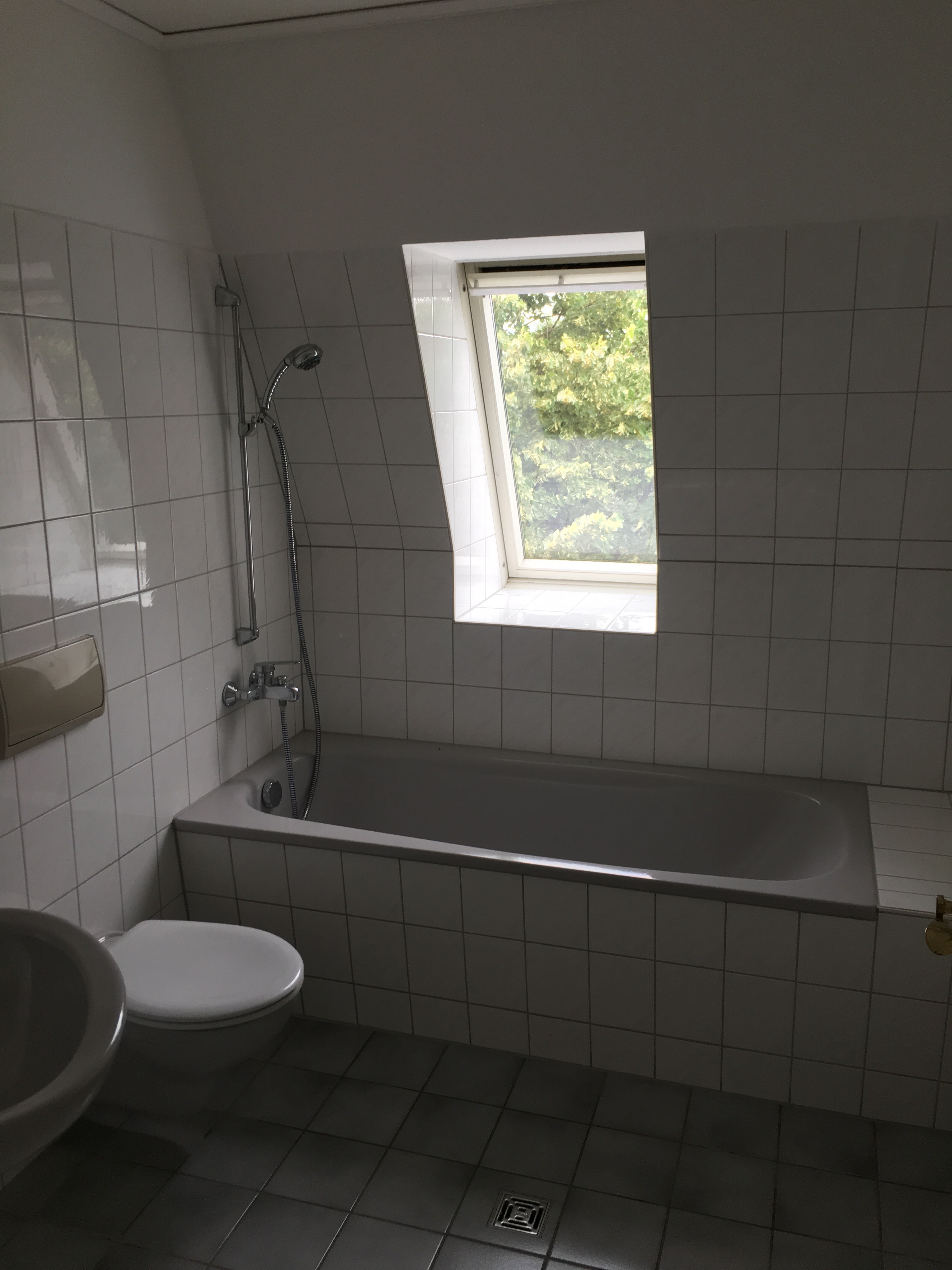 • Bad mit Badewanne und Fenster, Bodeneinlauf, Waschmaschinenanschluss